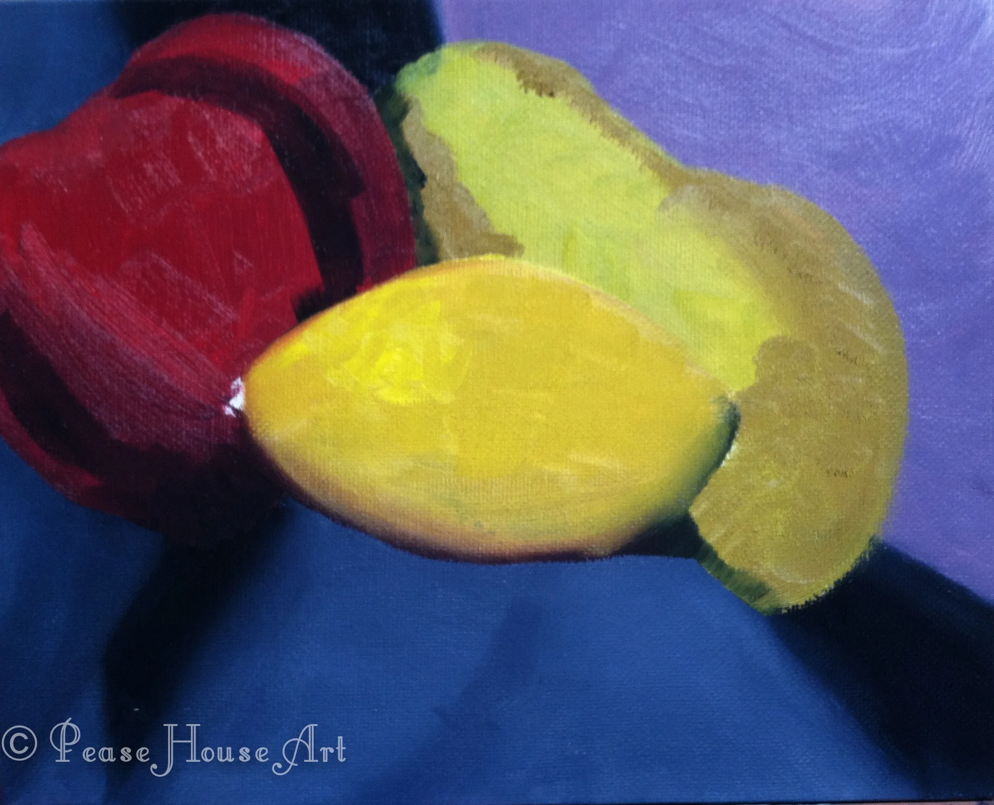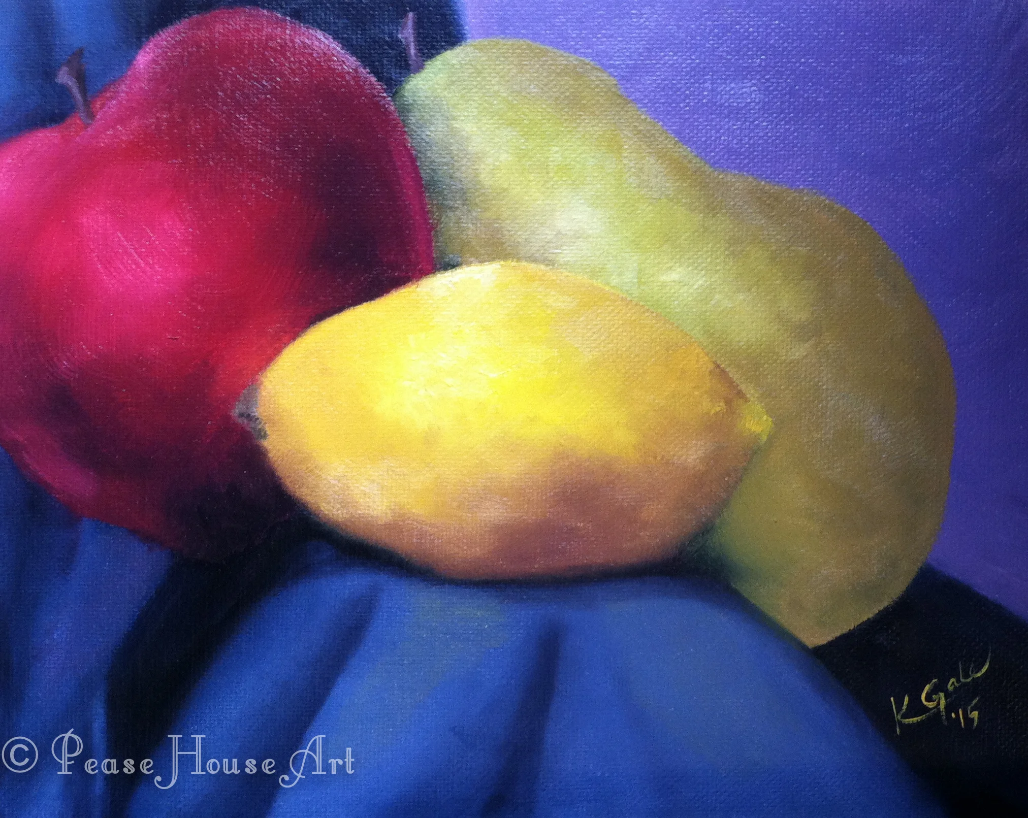 This was really fun. Portraits are definitely my favorite paintings, but fabric is a close second and fruit is not entirely unlike flesh. So this was quite enjoyable. I like the contrast of the shadows and light and I also like how the reflected colors through the piece help unite it.
