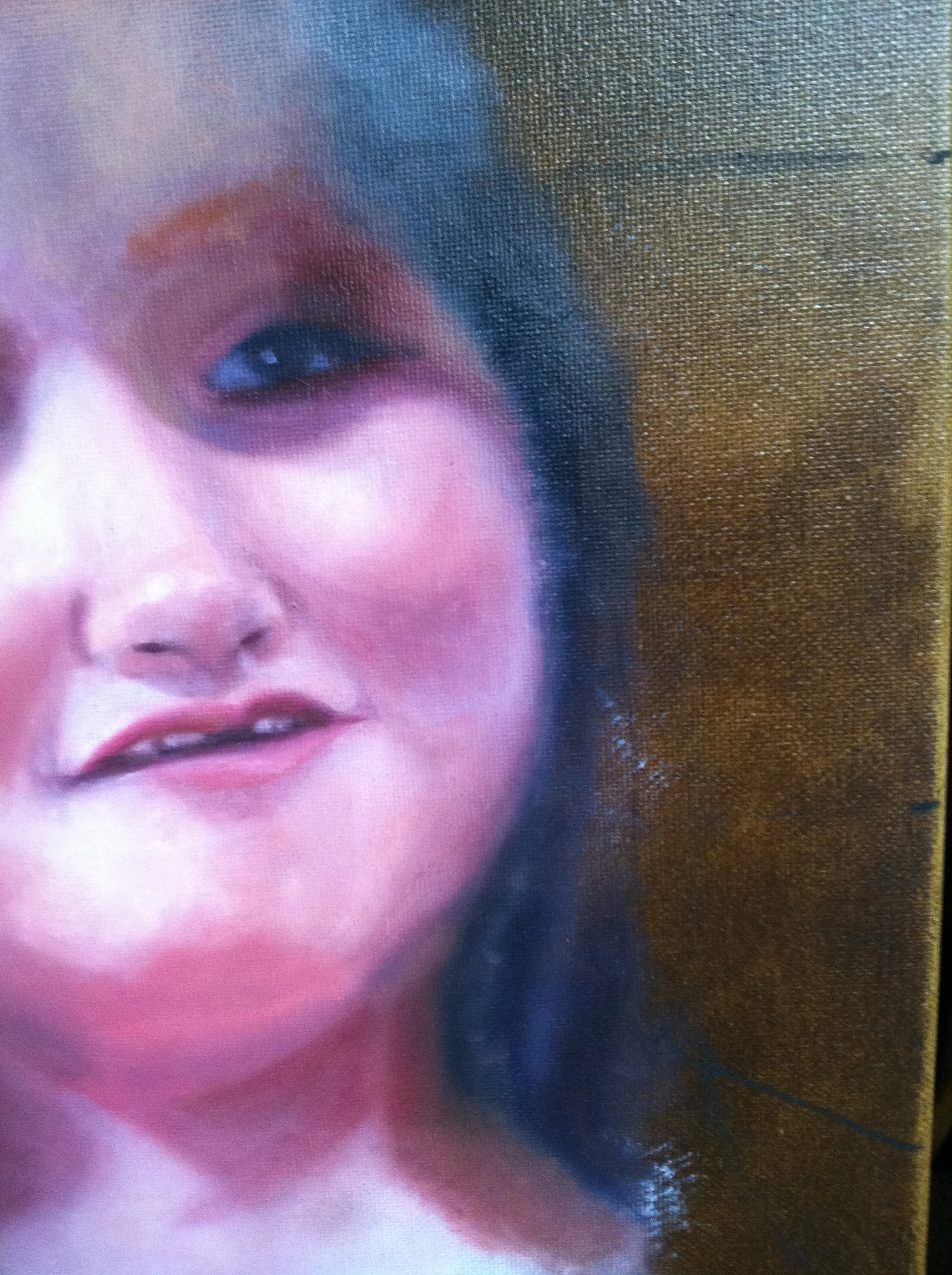 As you can see in this image, I got past the paint-by-number stage! The colors are beginning to blend well, the shapes and colors are beginning to align, and she is actually starting to look like K. That's always a relief!