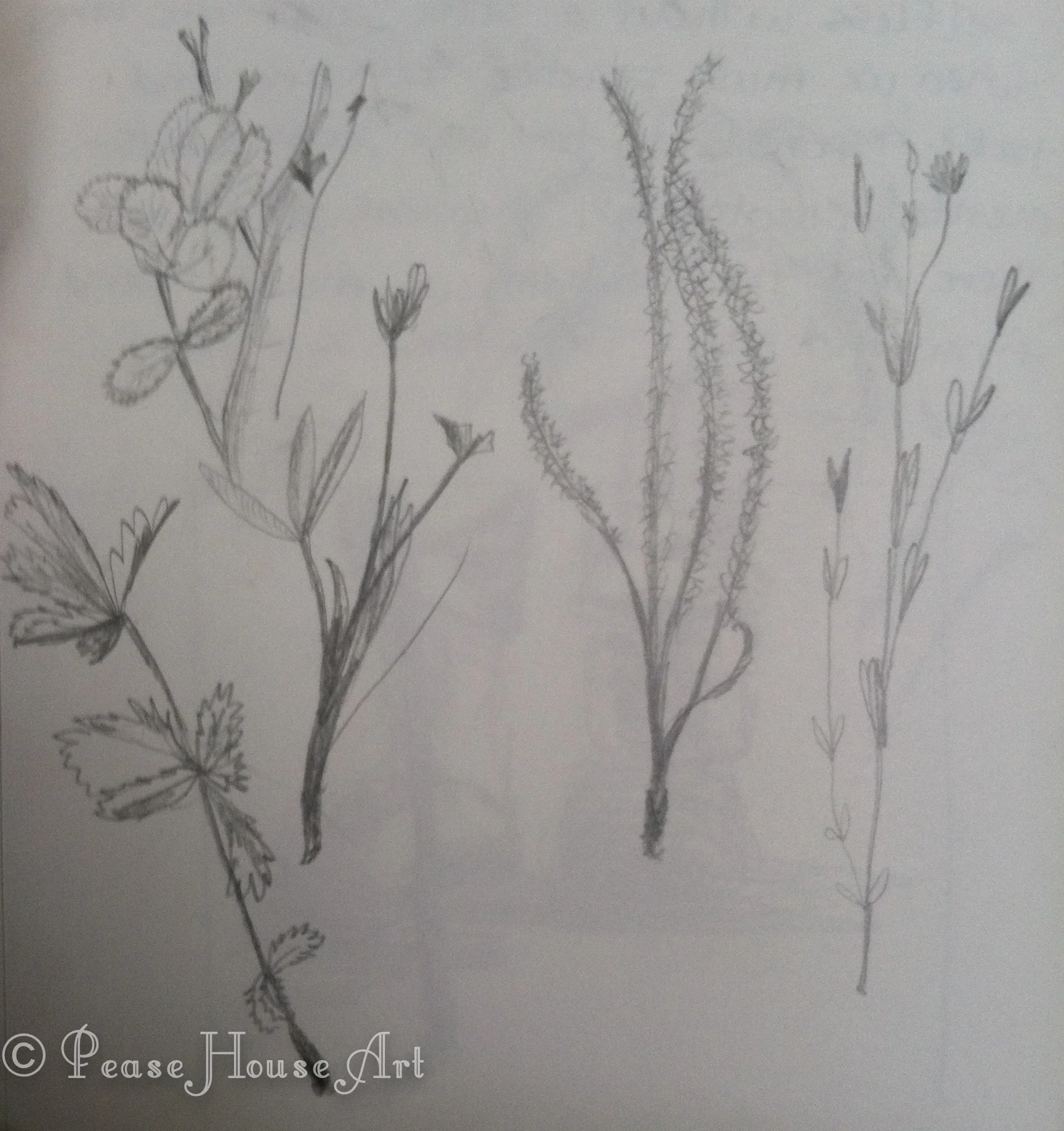 I was challenged to collect and press five flowers. I imagined gathering all of the fabulous colors found everywhere here on the coast in the spring. However, life offered me a different option while we were camping in a ponderosa pine forest. It was in central Oregon in a high altitude, arid region. I was surprised to find a huge lack of flowers. So, instead of picking and pressing any colorful blossoms, I captured the local flora in a different way. These are life-size or larger than the originals.