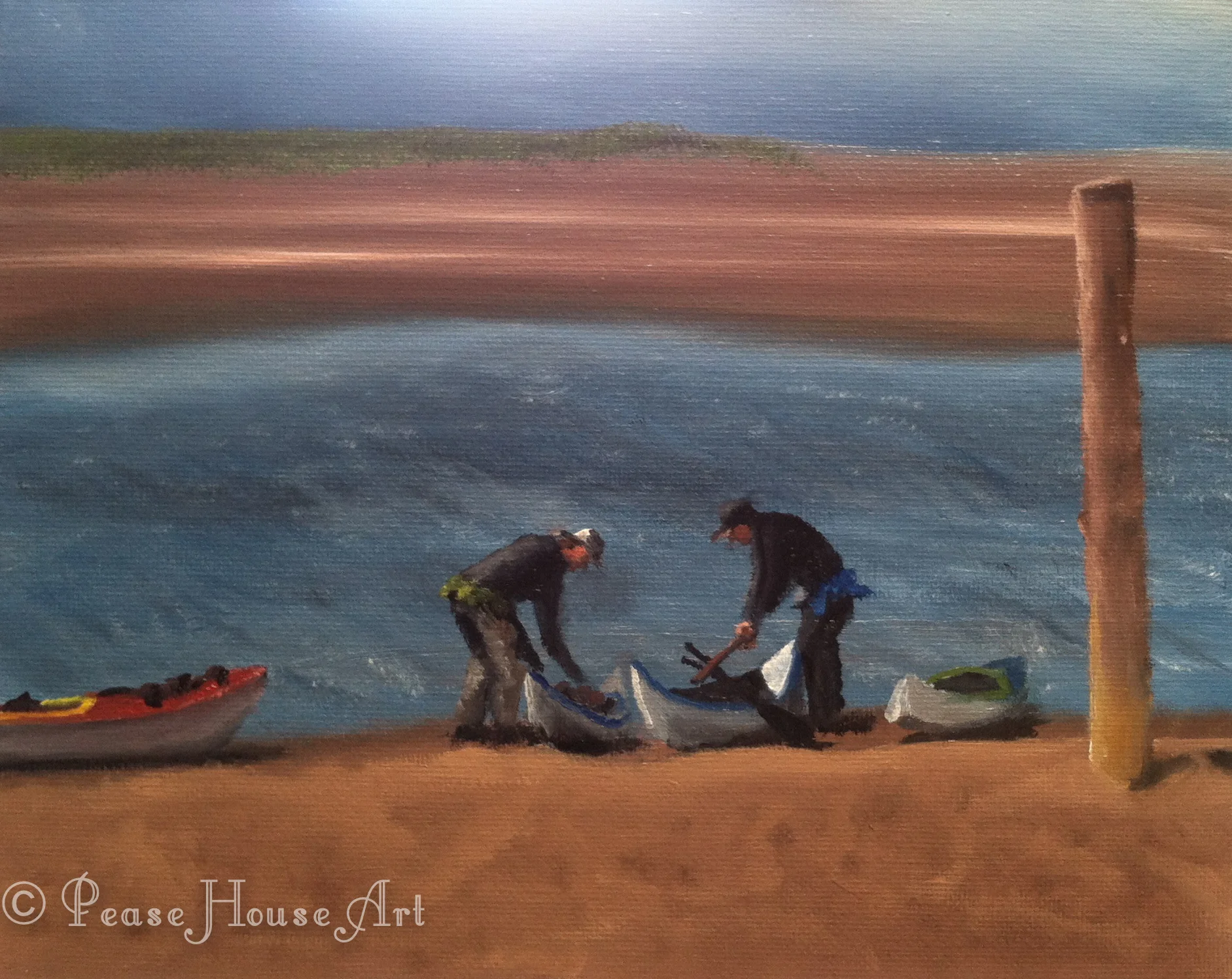 As I sat at Netarts Bay sketching and journaling I couldn't help but hear the group of kayakers near me. They obviously hadn't checked the tide charts and had arrived to find a low tide. They spent a good 30 minutes trying to decide if it was worth it, or if they should just go home. It sounded like one was a guide or instructor and the others were of vacation. I so wanted to tell them to just go for it! It may not be the perfect conditions, but they were there, they had their gear, and they may not get the opportunity again. I was so relieved when they finally made the choice to make the best of what they had. By the time they were ready to get in their kayaks I had to go. But I did get a few sketches and photos and now a painting of them preparing the kayaks.