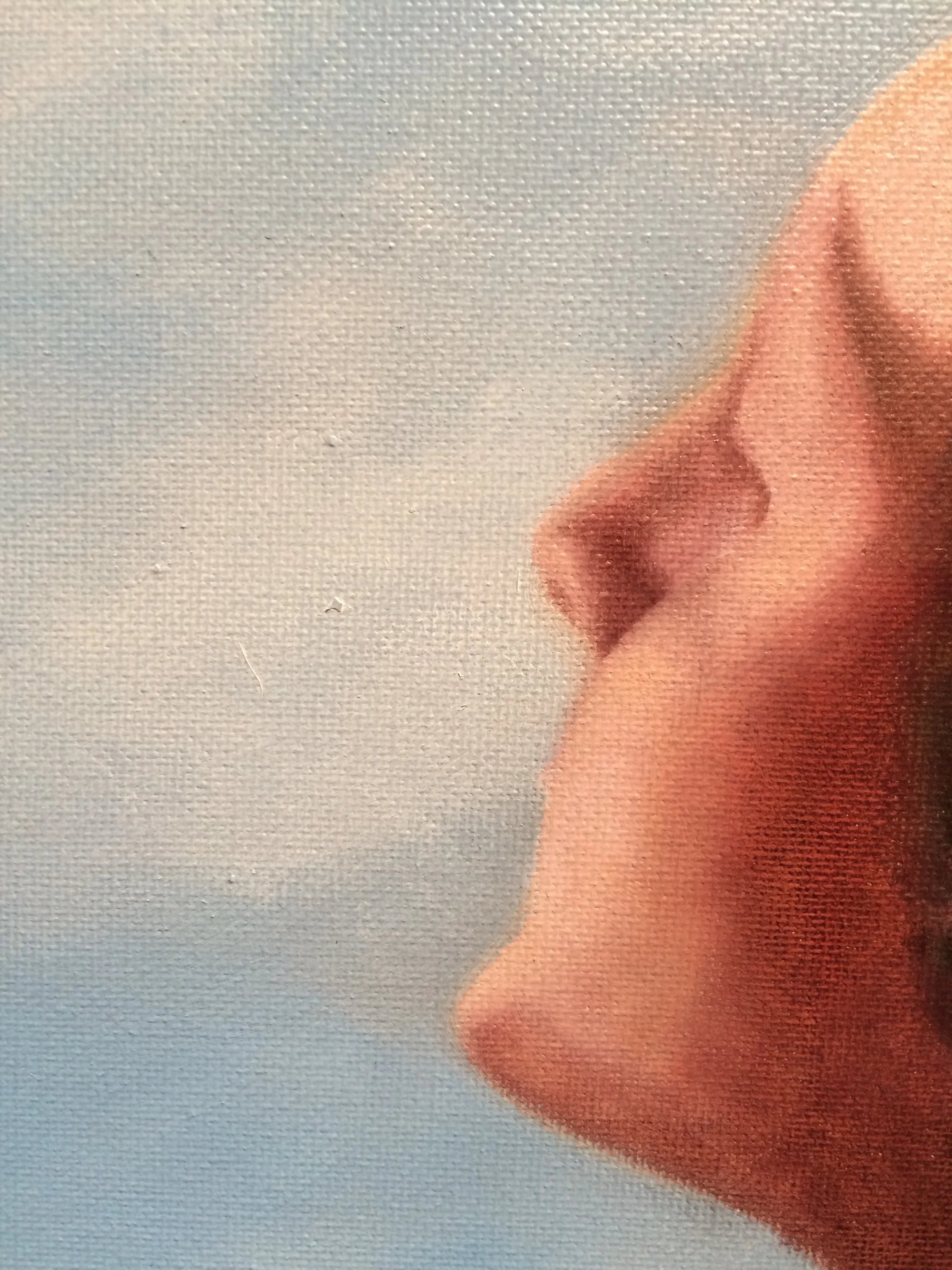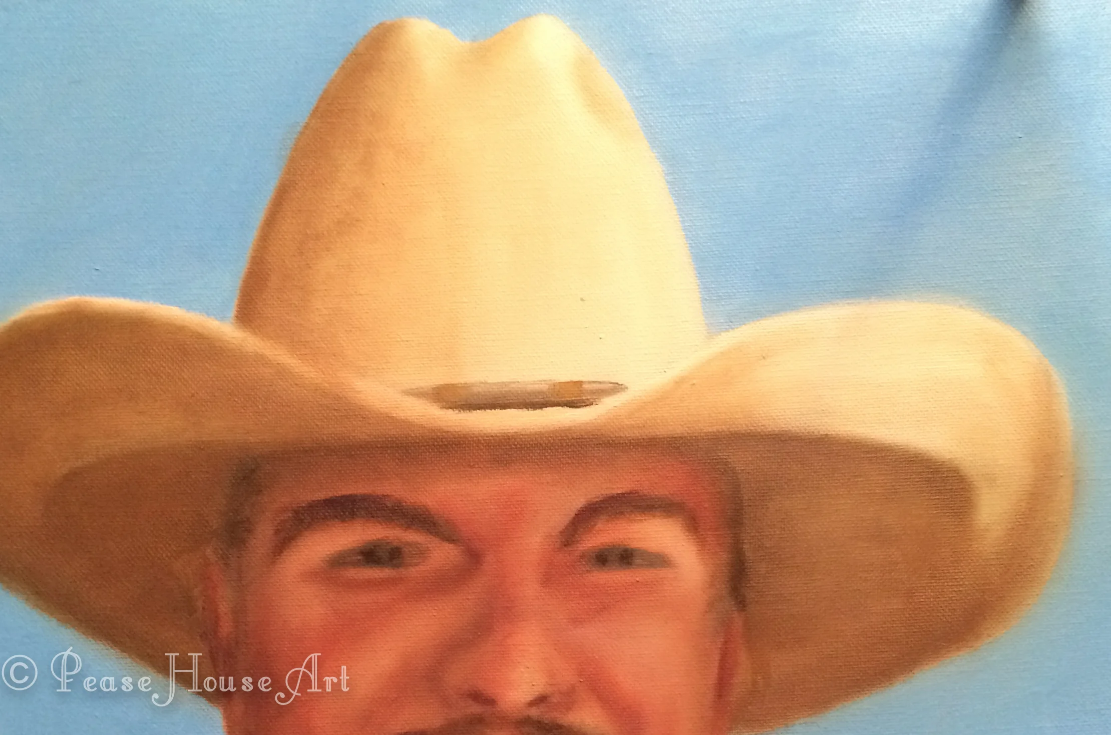 When starting a face I first try to find the areas of highlight (lights) and shadow (darks) that define the plane changes on the face. It's tempting to go into great detail on one facial feature, like an eye, but it's better in the end to make sure all the general areas are correct first. I've made the mistake before of perfecting an eye and then realizing I painted it too high or too low or too far to the right or left and having to repaint it. Lesson learned...
