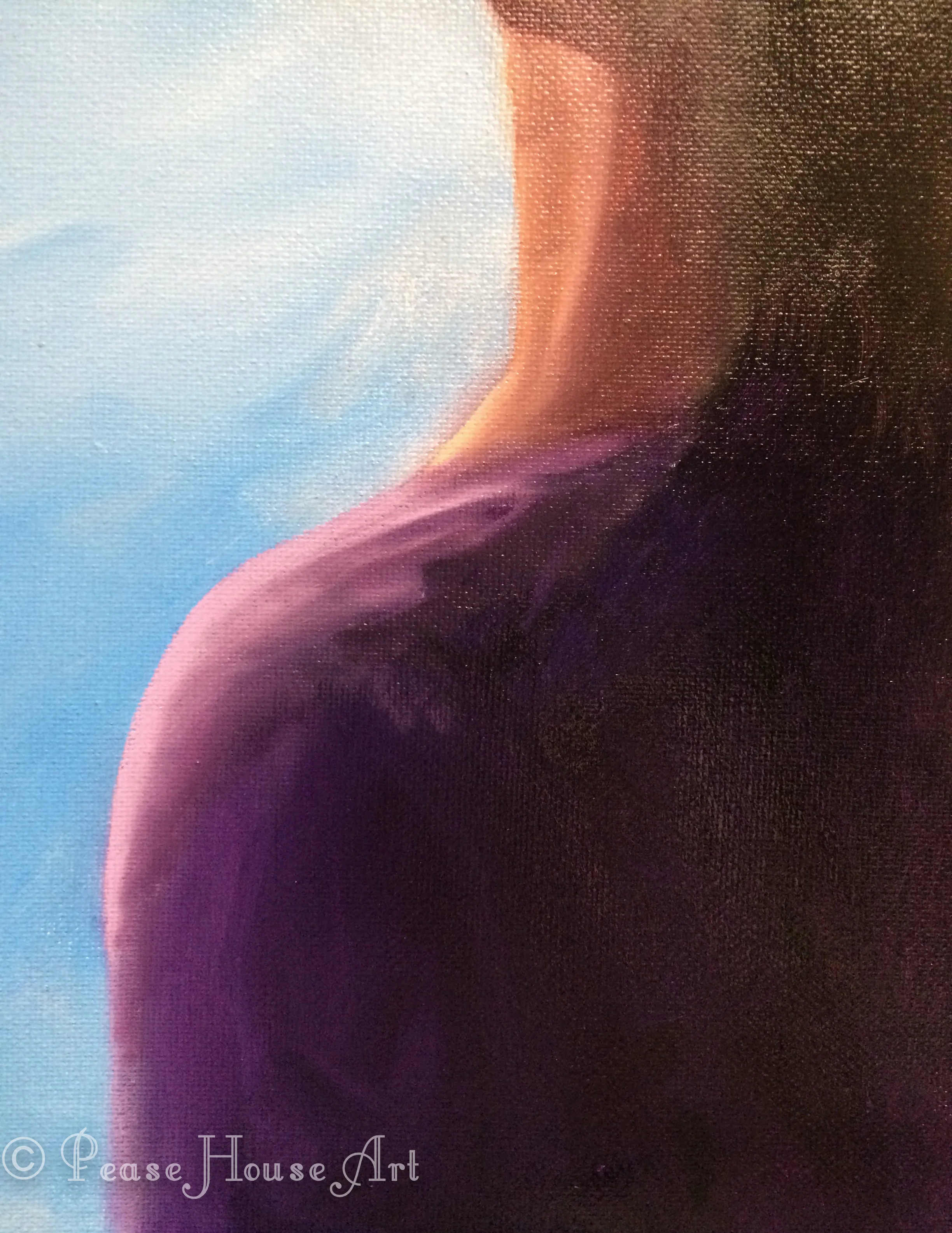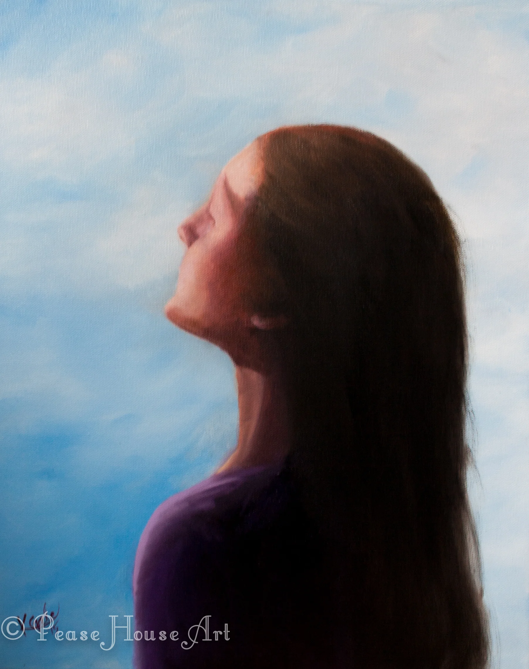 This is the first painting in a series I am going to do on the concept of Comfort. To me, comfort is warm. When I think of warm comfort I think of standing outside with my face to the sun. Today it's raining outside. I can hear the drops pelting the skylight in my studio and it reminds me of some of the old farm buildings when I was child. The sound makes me feel cold even though the temperature inside is very comfortable. And yet, I can look at her and see her embracing the light and warmth of the sun and suddenly I feel warm again. Many people have a "happy place" in their mind that they can go to when life gets stressful, and it can help them calm down. While this isn't really a place, it is an image that can bring a sense of warmth and comfort when life gets hard.