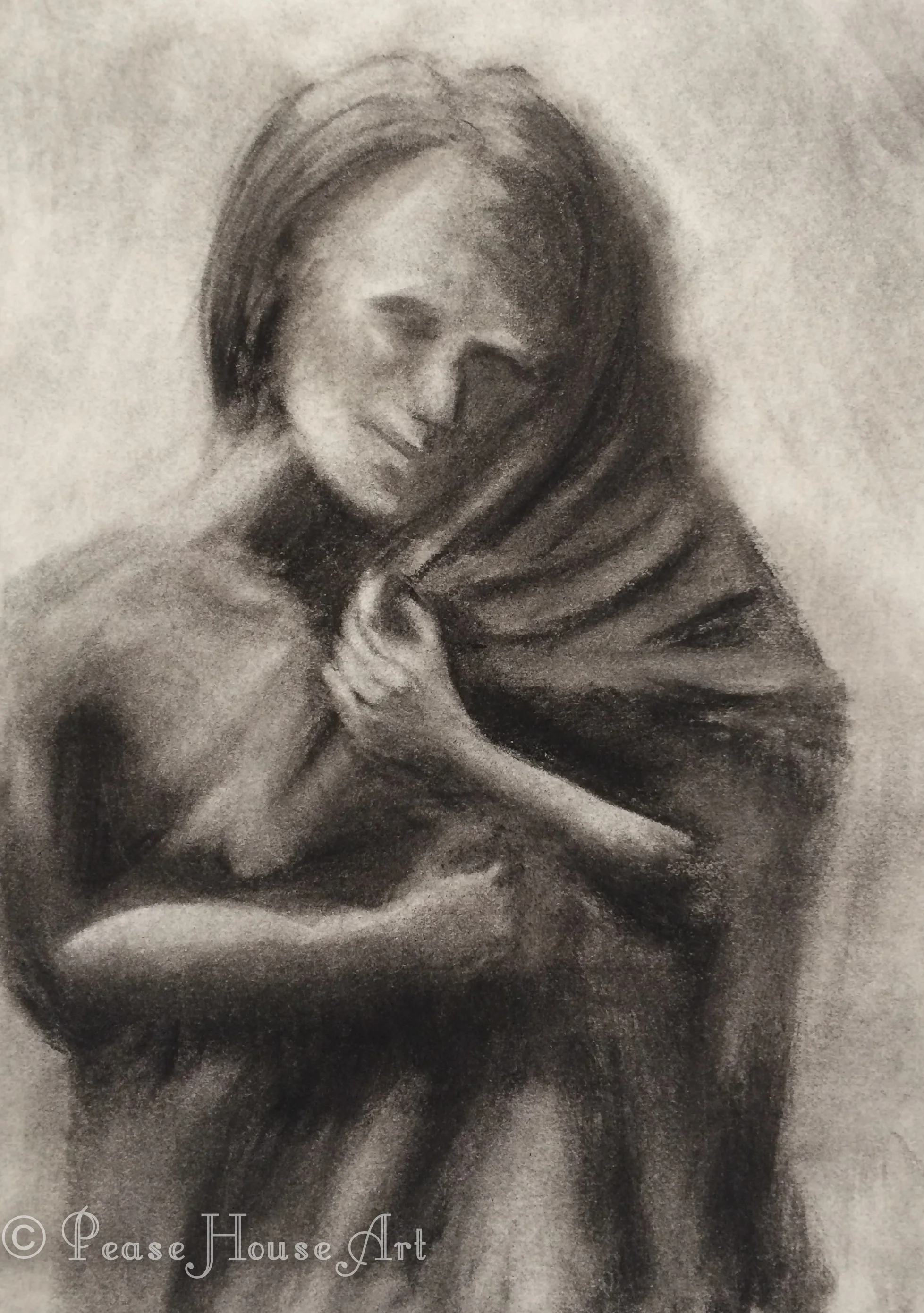 This is a charcoal drawing I did as a concept sketch for my next painting. Still working with the idea of Comfort, this piece will be about embracing. Often an embrace is pictured with two people in a hug. But I wanted to capture the idea with just a single figure. When I think of being embraced, enwrapped, cuddled, and snuggled in comfort, I think of a warm, soft blanket. I want her to have a look of appreciation and familiarity more than a relief from fear or struggle. I'm having fun with the charcoals. I'm not spending the time on them that I do with the paints, but just playing with them again is fun!