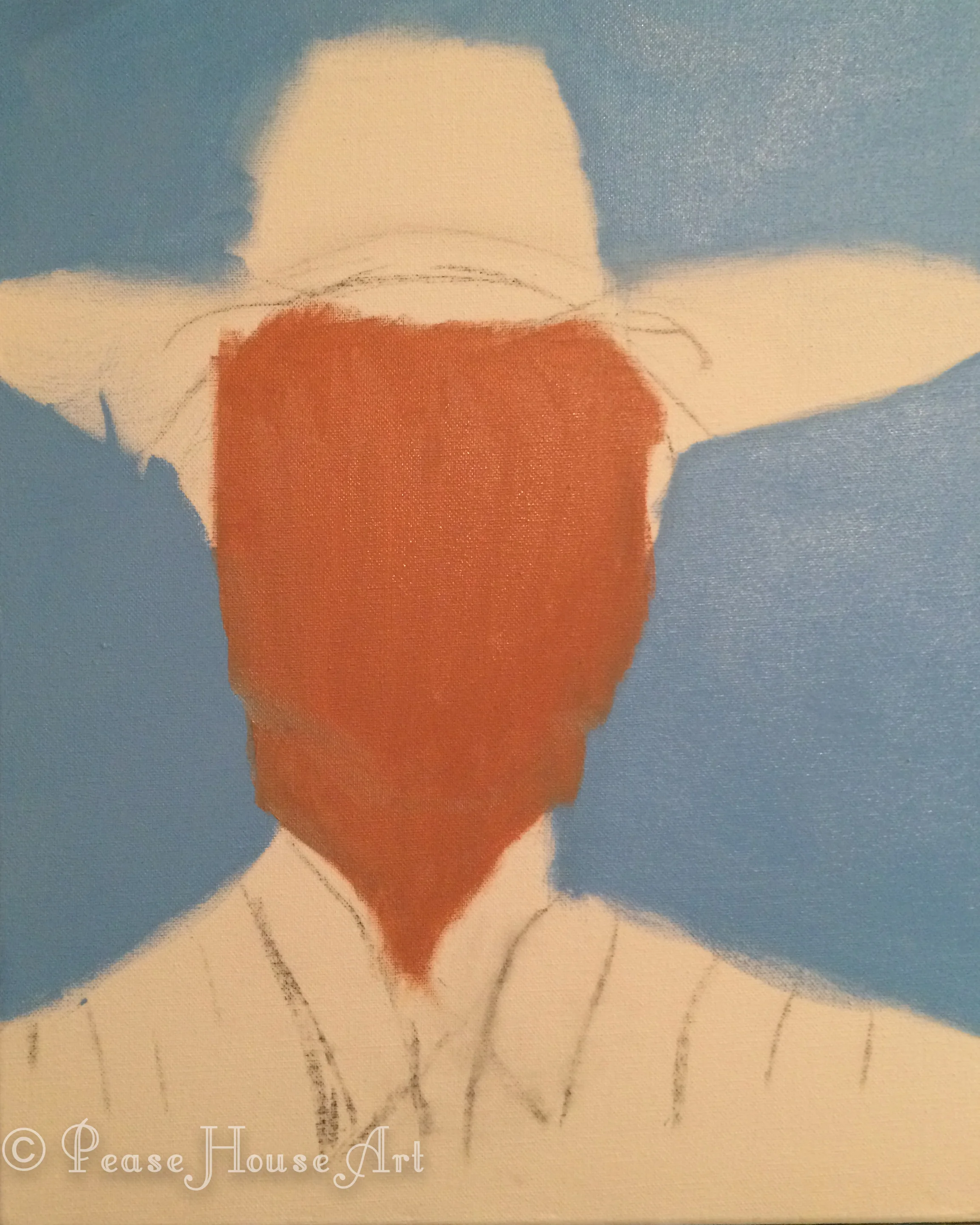 It doesn't look like I've done much here, but the truth is that I've done a lot of work that can't be seen on the canvas. The request is that I use one reference for the face, a different reference for the hat and clothes, and I have to adjust the lighting on the subject. So that big blob of brown in the middle of the canvas actually took a great deal of effort. Have I mentioned that this is going to be a very difficult painting? Yes, I'm whining about it.