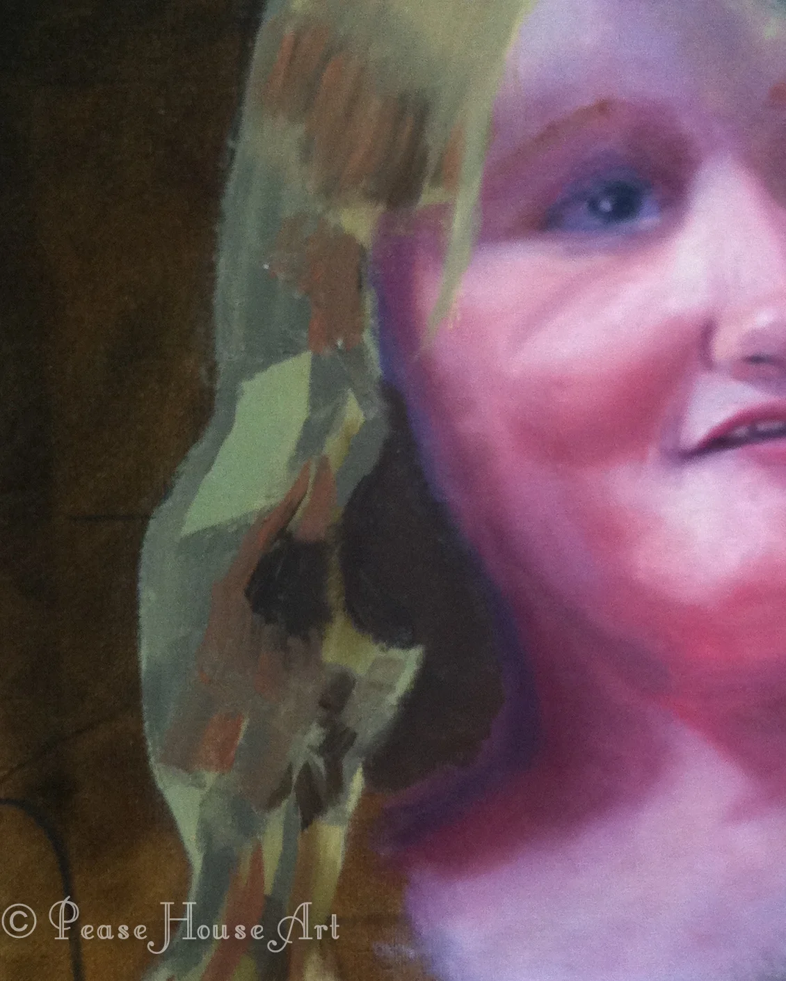 Hair can be difficult to paint and I admit I generally really struggle with it. There is the temptation to paint every strand. But, as always, the eye does not see what we know to be true. So while we understand that she has a million single strands of hair, we don't see her that way. We see a general shape of what we know to be hair and we recognize a few individual strands that represent all the rest of them. Next time you see someone, pay more attention to how you see their hair.
