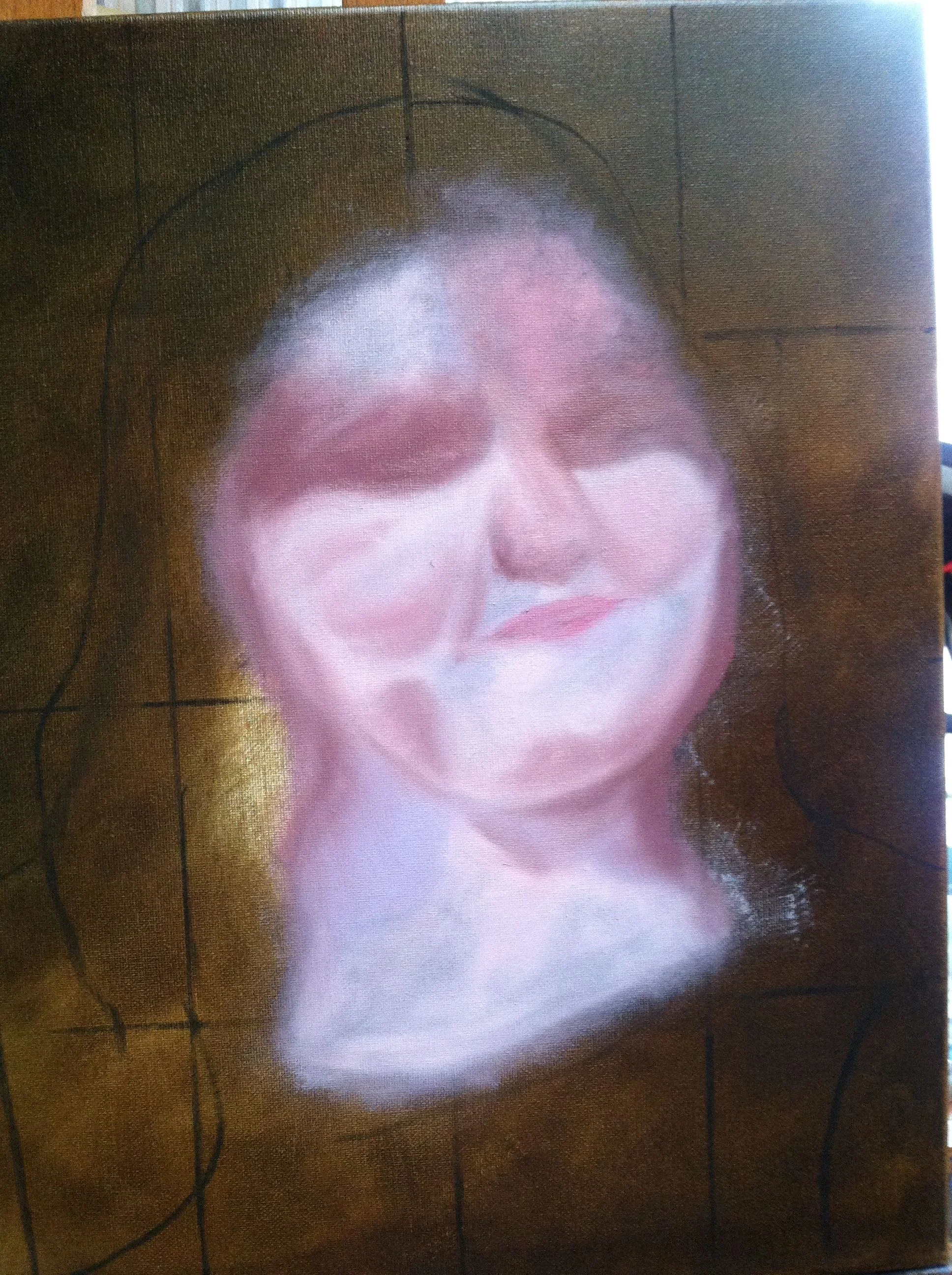 Blocking in... I used the grid method to help me sketch the outline for K's face. The initial colors are quite like, but it gives me a place to start. I like to layer my colors so what goes on first is not necessarily, and very often not, the colors that will be there in the end. One of my favorite Brian Hoover quotes is, "There are only two things that can go wrong in a painting, either shape, or color". In fact, a few of us formed a group who painted outside of regular class hours and called ourselves the Paint and Color Club. Ahhhh... good times...